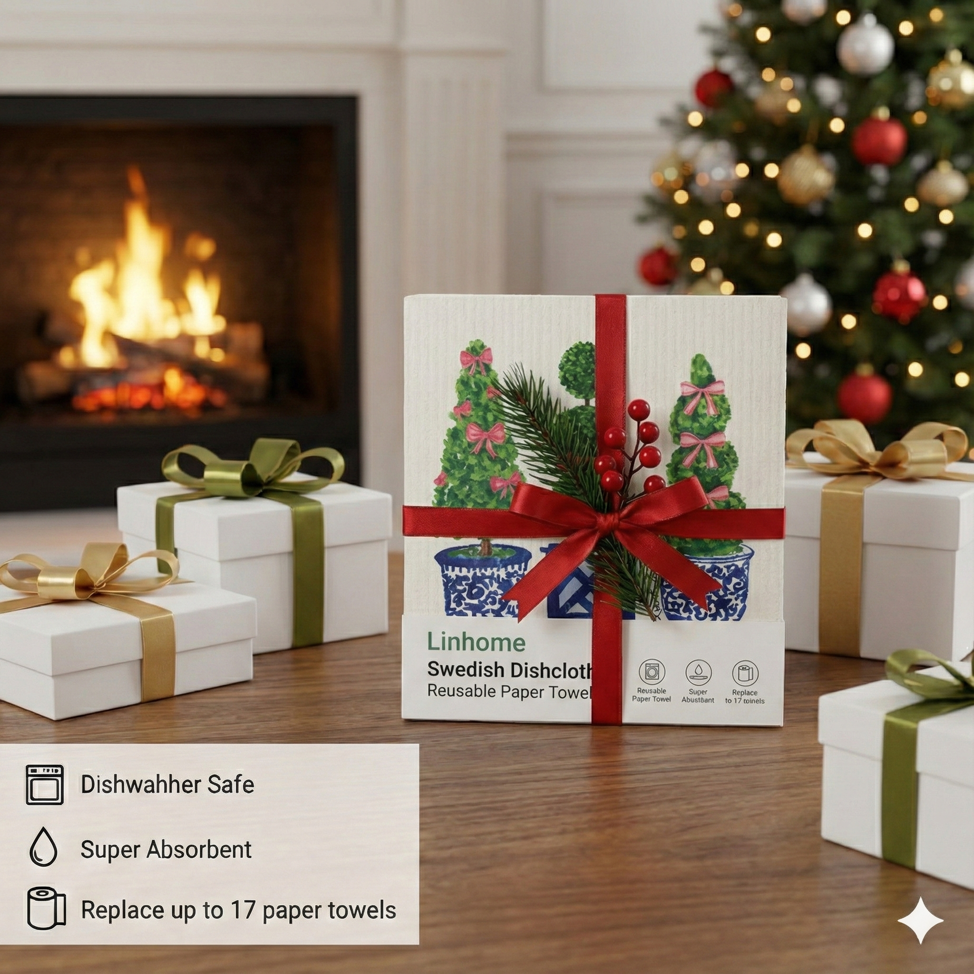 Evergreen Holiday Collection Festive Topiaries Trio- Linhome x Liesel Anne Swedish Dishcloths - 1 Pack