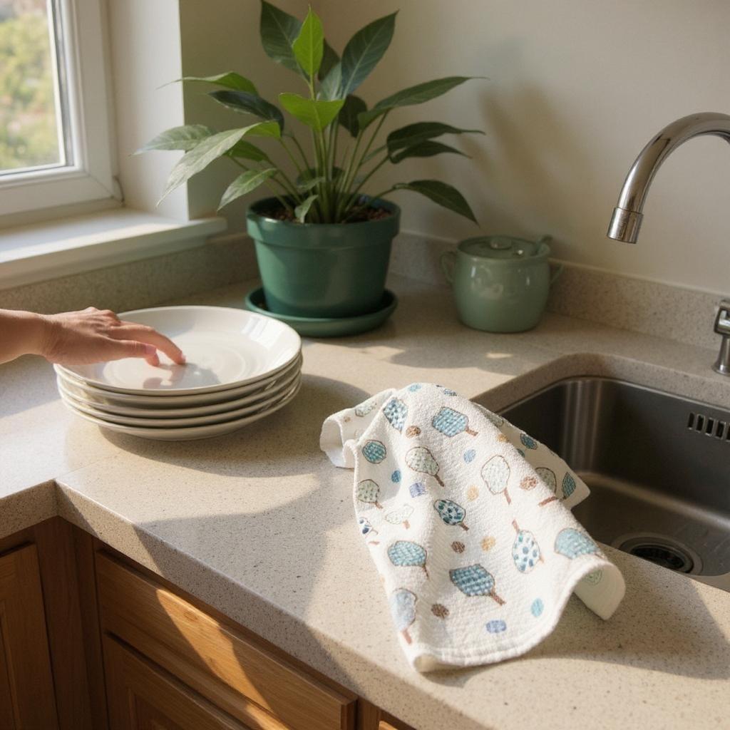 As someone who cleans their kitchen about 5 times a day, these seem like they were made for me. I am constantly wiping up my white counters because any tiny speck of anything shows up. Using a cotton hand towel is fine for water, but I don't like how they get stained easily from coffee, etc. So these towels are perfect for the more dirty messes because they're thick and absorbent so pick up a lot of mess. Then you can rinse them off and let them dry out. If they get really soiled, you can throw them in the dishwasher. I put them on the top rack with silverware, because it's not as hot/intense as the lower shelves.